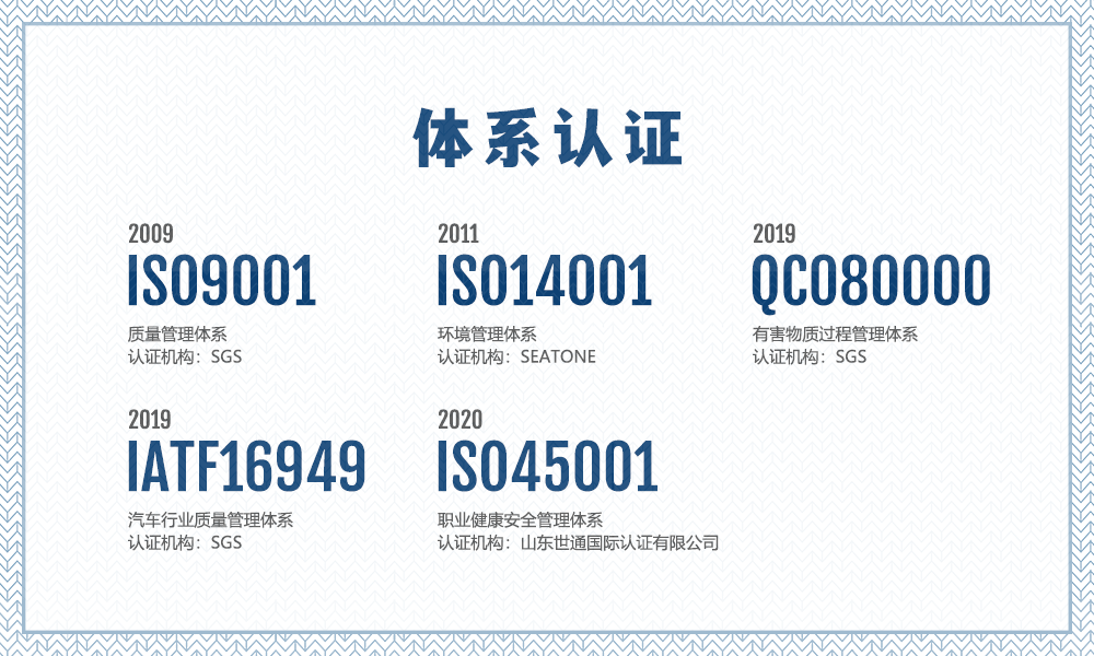 公司制定了“以質(zhì)量創(chuàng)信譽(yù),以服務(wù)爭客戶,以科技求創(chuàng)新,以改進(jìn)促發(fā)展”的質(zhì)量方針,建設(shè)了山東省工程實驗室、山東省企業(yè)技術(shù)中心、山東省“一企一技術(shù)”研發(fā)中心,通過了ISO9001質(zhì)量管理體系、ISO14001環(huán)境管理體系、QC080000體系、IATF16949汽車體系、ISO45001職業(yè)健康管理體系及企業(yè)知識產(chǎn)權(quán)管理體系,兩化融合管理體系等認(rèn)證,使公司產(chǎn)品質(zhì)量達(dá)到國際化標(biāo)準(zhǔn),為產(chǎn)品穩(wěn)定性提供強(qiáng)有力的體系保證。