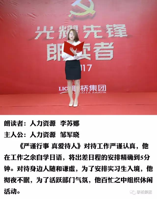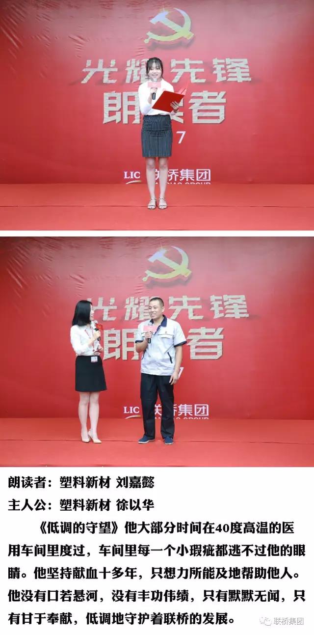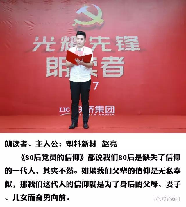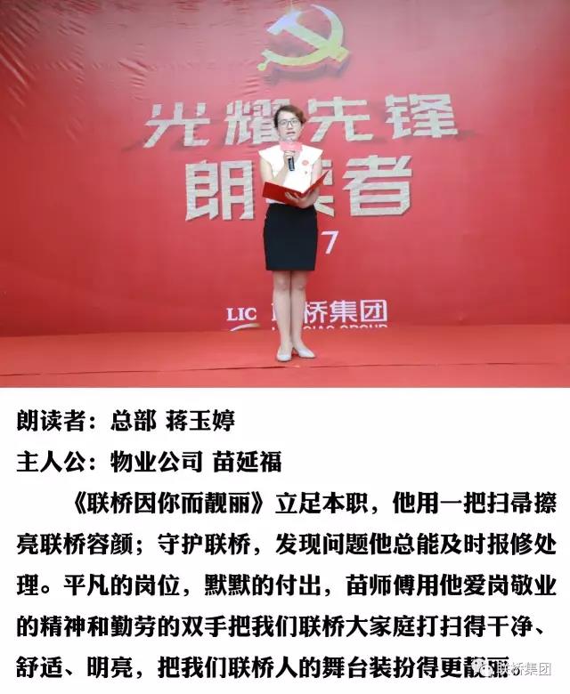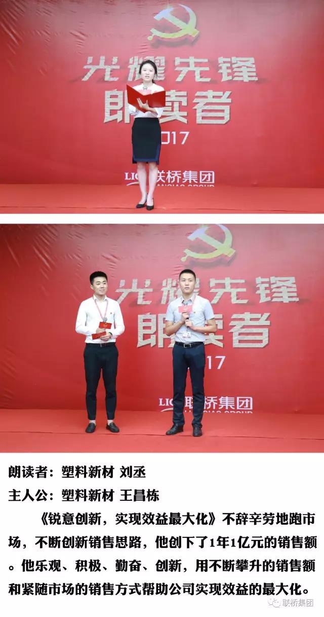 2017年7月26日下午,聯(lián)橋集團黨委舉辦了“光耀先鋒朗讀者”活動,150名黨員齊聚一堂,用《朗讀者》的節(jié)目形式,講述聯(lián)橋光耀先鋒優(yōu)秀黨員的感人故事。集團黨委書記、董事長慕镕鍵,集團董事、塑料新材黨支部書記慕衛(wèi)波,集團黨委副書記宋威麗等領(lǐng)導出席了活動。